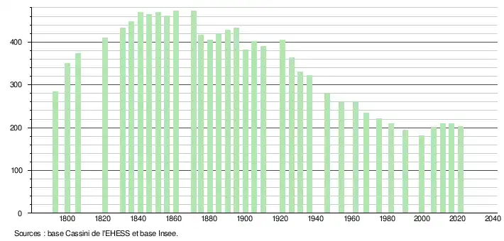 L'évolution du nombre d'habitants est connue à travers les recensements de la population effectués dans la commune depuis 1793. Pour les communes de moins de 10 000 habitants, une enquête de recensement portant sur toute la population est réalisée tous les cinq ans, les populations légales des années intermédiaires étant quant à elles estimées par interpolation ou extrapolation[15]. Pour la commune, le premier recensement exhaustif entrant dans le cadre du nouveau dispositif a été réalisé en 2006[16].