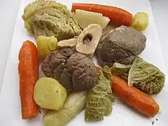 - des légumes : carotte, navet, poireau, parfois pomme de terre (qui n’a été introduite que tard[7], au cours du XVIIIe siècle au moment de sa promotion en France par Antoine Parmentier), céleri-rave, oignon (selon les régions et les recettes) ;