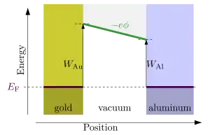 Lorsque deux métaux sont électriquement isolés l'un de l'autre, une différence de potentiel arbitraire peut exister entre eux. Cependant, lorsque deux surfaces métalliques neutres différentes sont mises en contact électrique (même indirectement, à travers un long fil électroconducteur par exemple), les électrons s'écouleront du métal avec le niveau de Fermi le plus élevé vers le métal avec le niveau de Fermi inférieur jusqu'à ce que les deux niveaux, dans les deux phases s'équilibrent (équilibre thermodynamique) (le nombre réel d'électrons qui passent entre les deux phases est généralement faible). Cependant, ce n'est pas parce que les niveaux de Fermi sont égaux que les potentiels électriques sont égaux. Le potentiel électrique à l'extérieur de chaque matériau est contrôlé par sa fonction de travail, et ainsi même à l'équilibre, des métaux différents peuvent montrer une différence de potentiel électrique.