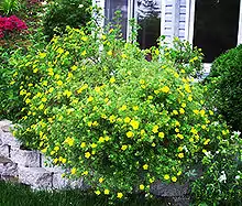 - Potentilla fruticosa L. récemment renommée Dasiphora fruticosa - Potentille ligneuse. Arbuste de jardin très courant. Elle présente des petites fleurs jaunes, parfois roses.