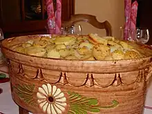Les éléments servant au ervice des mets, souvent mentionnées dans les inventaires après décès, sont plus souvent des objets utilisés collectivement qu’individuellement[25]. Avant la Révolution française, l'usage de la vaisselle en terre cuite n'est pourtant pas généralisé : les convives se servent parfois directement dans la marmite, utilisent des assiettes en bois, puis des assiettes en étain au cours du XVIIIe siècle[25]. À partir du XVIIe siècle, de grands plats en terre cuite sont utilisés pour un usage collectif : chaque convive y puise à l’aide de sa cuiller en bois ou de ses doigts. La vaisselle individuelle n’est en effet pas encore utilisée dans les milieux modestes. Et c’est surtout à la fin du XVIIIe siècle que se diversifient les formes et que se multiplient les objets utilitaires, dans le domaine culinaire (faisselles, barattes) comme ailleurs.