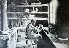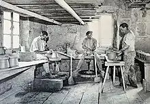 La motte de terre placée sur le tour est creusée par le potier, puis les parois du pot s'élèvent grâce à l'action des mains de l'artisan, qui finit de lui donner la forme prévue en le tournant (tourner = dräje)[19]. Un potier parvient à créer jusqu'à 300 pièces par jour[20]. Un autre ouvrier est chargé de poser des anses, verticales ou horizontales selon le modèle prévu, préalablement coupées dans des colombins d'argile. Les pots terminés sont alors mis à sécher sur des étagères.