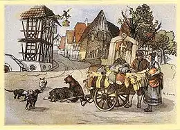 Ce sont des marchands ambulants (Gschirmann)[39] qui diffusent ces produits à une distance de 20 à 30 km du lieu de production. Ils se déplacent avec une charrette à bras bâchée ou des voitures plus grandes tirées par un cheval, plus tard, dans des camionnettes. Ils y transportent tous les types de poteries fabriquées localement, en terre vernissée comme en grès, prenant soin de les enfouir dans des bottes de paille, parfois même de protéger chaque pot par un treillis métallique.