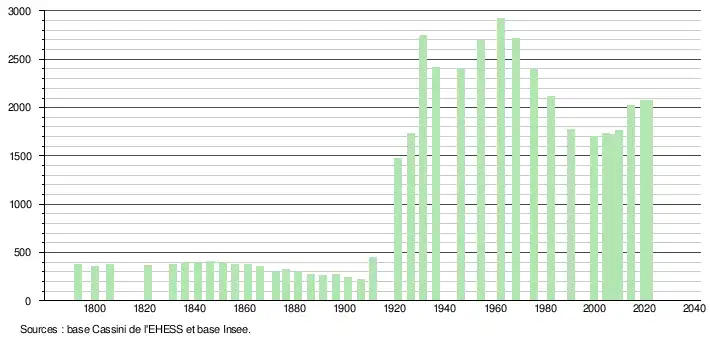 L'évolution du nombre d'habitants est connue à travers les recensements de la population effectués dans la commune depuis 1793. Pour les communes de moins de 10 000 habitants, une enquête de recensement portant sur toute la population est réalisée tous les cinq ans, les populations légales des années intermédiaires étant quant à elles estimées par interpolation ou extrapolation[23]. Pour la commune, le premier recensement exhaustif entrant dans le cadre du nouveau dispositif a été réalisé en 2004[24].