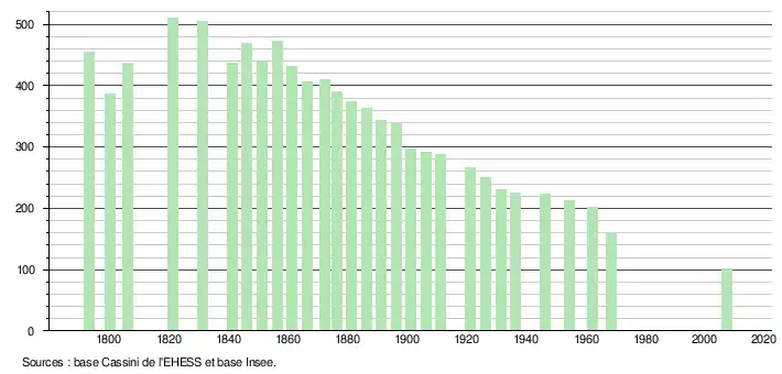 L'évolution du nombre d'habitants est connue à travers les recensements de la population effectués dans la commune depuis 1793. À partir du , les populations légales des communes sont publiées annuellement dans le cadre d'un recensement qui repose désormais sur une collecte d'information annuelle, concernant successivement tous les territoires communaux au cours d'une période de cinq ans. Pour les communes de moins de 10 000 habitants, une enquête de recensement portant sur toute la population est réalisée tous les cinq ans, les populations légales des années intermédiaires étant quant à elles estimées par interpolation ou extrapolation[7]. Pour la commune, le premier recensement exhaustif entrant dans le cadre du nouveau dispositif a été réalisé en [8],[Note 1].