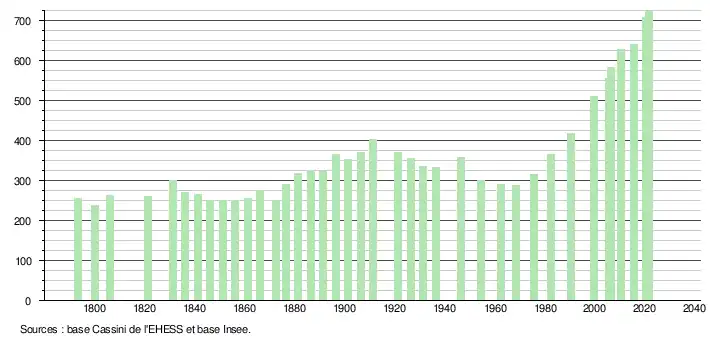 L'évolution du nombre d'habitants est connue à travers les recensements de la population effectués dans la commune depuis 1793. Pour les communes de moins de 10 000 habitants, une enquête de recensement portant sur toute la population est réalisée tous les cinq ans, les populations légales des années intermédiaires étant quant à elles estimées par interpolation ou extrapolation[24]. Pour la commune, le premier recensement exhaustif entrant dans le cadre du nouveau dispositif a été réalisé en 2005[25].