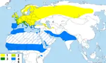 - P. c. collybita (Vieillot, 1817), la sous-espèce type, se reproduit en Europe, à l'est de la Pologne et de la Bulgarie. Elle hiverne dans le sud, sur le pourtour méditerranéen et en Afrique du Nord[20]. On le trouve de plus en plus au nord, et il est observé en Scandinavie depuis 1970 et près de l'extrémité sud de l'aire de répartition de P. c. abietinus[25].