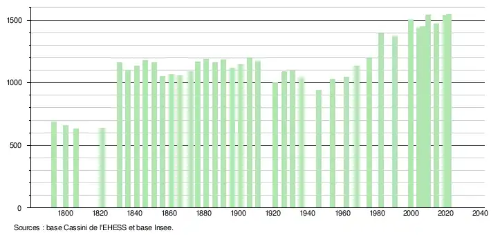 L'évolution du nombre d'habitants est connue à travers les recensements de la population effectués dans la commune depuis 1793. Pour les communes de moins de 10 000 habitants, une enquête de recensement portant sur toute la population est réalisée tous les cinq ans, les populations légales des années intermédiaires étant quant à elles estimées par interpolation ou extrapolation[15]. Pour la commune, le premier recensement exhaustif entrant dans le cadre du nouveau dispositif a été réalisé en 2004[16].