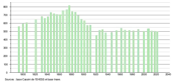 L'évolution du nombre d'habitants est connue à travers les recensements de la population effectués dans la commune depuis 1793. Pour les communes de moins de 10 000 habitants, une enquête de recensement portant sur toute la population est réalisée tous les cinq ans, les populations légales des années intermédiaires étant quant à elles estimées par interpolation ou extrapolation[30]. Pour la commune, le premier recensement exhaustif entrant dans le cadre du nouveau dispositif a été réalisé en 2007[31].