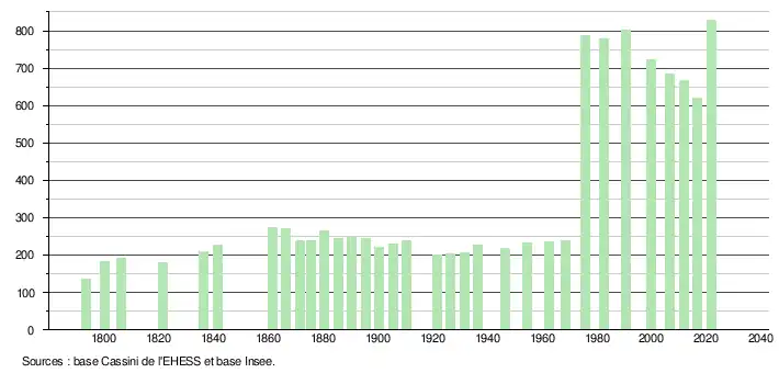 L'évolution du nombre d'habitants est connue à travers les recensements de la population effectués dans la commune depuis 1793. Pour les communes de moins de 10 000 habitants, une enquête de recensement portant sur toute la population est réalisée tous les cinq ans, les populations légales des années intermédiaires étant quant à elles estimées par interpolation ou extrapolation[16]. Pour la commune, le premier recensement exhaustif entrant dans le cadre du nouveau dispositif a été réalisé en 2006[17].