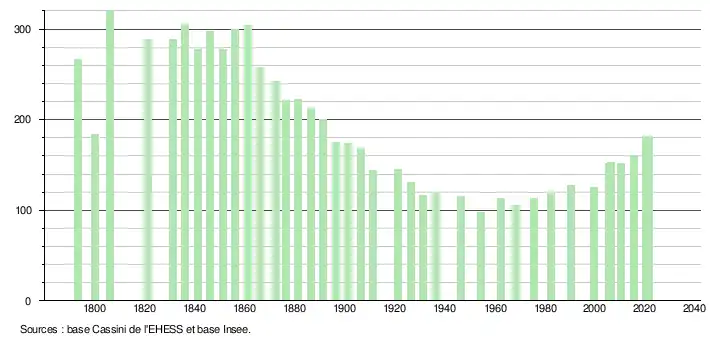L'évolution du nombre d'habitants est connue à travers les recensements de la population effectués dans la commune depuis 1793. Pour les communes de moins de 10 000 habitants, une enquête de recensement portant sur toute la population est réalisée tous les cinq ans, les populations légales des années intermédiaires étant quant à elles estimées par interpolation ou extrapolation[25]. Pour la commune, le premier recensement exhaustif entrant dans le cadre du nouveau dispositif a été réalisé en 2005[26].
