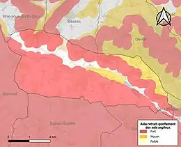 Le retrait-gonflement des sols argileux est susceptible d'engendrer des dommages importants aux bâtiments en cas d’alternance de périodes de sécheresse et de pluie. 89,2 % de la superficie communale est en aléa moyen ou fort (67,4 % au niveau départemental et 48,5 % au niveau national). Sur les 61 bâtiments dénombrés sur la commune en 2019, 55 sont en aléa moyen ou fort, soit 90 %, à comparer aux 81 % au niveau départemental et 54 % au niveau national. Une cartographie de l'exposition du territoire national au retrait gonflement des sols argileux est disponible sur le site du BRGM[20],[Carte 3].