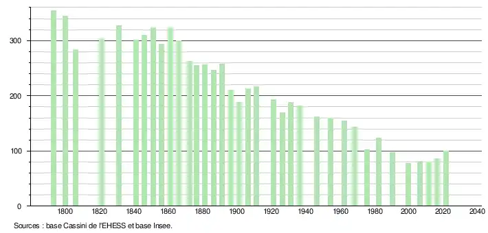 L'évolution du nombre d'habitants est connue à travers les recensements de la population effectués dans la commune depuis 1793. Pour les communes de moins de 10 000 habitants, une enquête de recensement portant sur toute la population est réalisée tous les cinq ans, les populations légales des années intermédiaires étant quant à elles estimées par interpolation ou extrapolation[28]. Pour la commune, le premier recensement exhaustif entrant dans le cadre du nouveau dispositif a été réalisé en 2006[29].