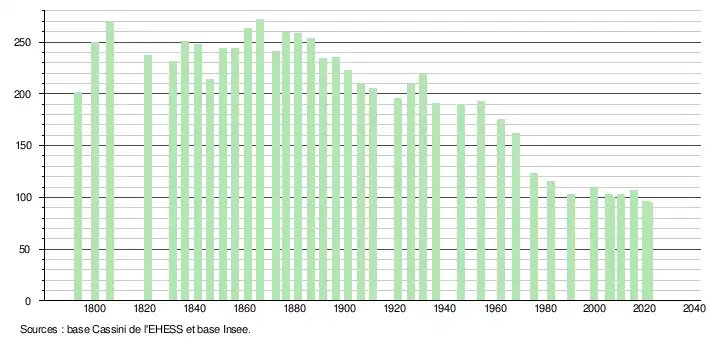 L'évolution du nombre d'habitants est connue à travers les recensements de la population effectués dans la commune depuis 1793. Pour les communes de moins de 10 000 habitants, une enquête de recensement portant sur toute la population est réalisée tous les cinq ans, les populations légales des années intermédiaires étant quant à elles estimées par interpolation ou extrapolation[32]. Pour la commune, le premier recensement exhaustif entrant dans le cadre du nouveau dispositif a été réalisé en 2005[33].