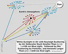 De ce fait le rayonnement qui parvient du Soleil est pondéré par un facteur proportionnel à où est la longueur d'onde : la partie du spectre visible proche du bleu est donc diffusée et observable partout dans le ciel alors que les rouges traversent l'atmosphère quasiment directement[3].