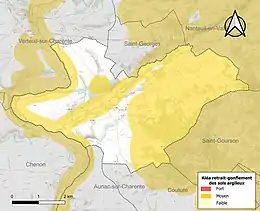 Le retrait-gonflement des sols argileux est susceptible d'engendrer des dommages importants aux bâtiments en cas d’alternance de périodes de sécheresse et de pluie. 69,3 % de la superficie communale est en aléa moyen ou fort (67,4 % au niveau départemental et 48,5 % au niveau national). Sur les 166 bâtiments dénombrés sur la commune en 2019, 83 sont en aléa moyen ou fort, soit 50 %, à comparer aux 81 % au niveau départemental et 54 % au niveau national. Une cartographie de l'exposition du territoire national au retrait gonflement des sols argileux est disponible sur le site du BRGM[20],[Carte 3].