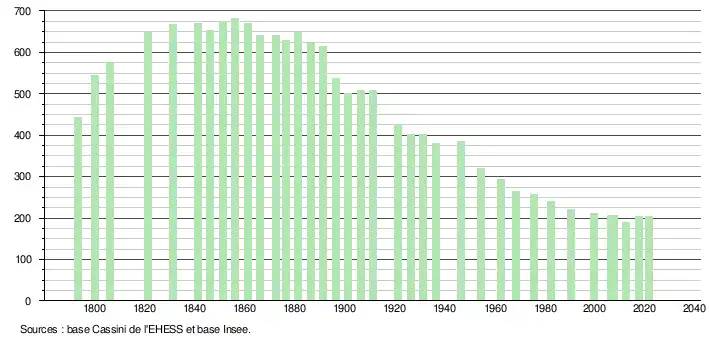 L'évolution du nombre d'habitants est connue à travers les recensements de la population effectués dans la commune depuis 1793. Pour les communes de moins de 10 000 habitants, une enquête de recensement portant sur toute la population est réalisée tous les cinq ans, les populations légales des années intermédiaires étant quant à elles estimées par interpolation ou extrapolation[28]. Pour la commune, le premier recensement exhaustif entrant dans le cadre du nouveau dispositif a été réalisé en 2007[29].