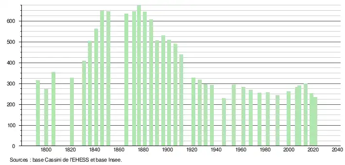 L'évolution du nombre d'habitants est connue à travers les recensements de la population effectués dans la commune depuis 1793. Pour les communes de moins de 10 000 habitants, une enquête de recensement portant sur toute la population est réalisée tous les cinq ans, les populations légales des années intermédiaires étant quant à elles estimées par interpolation ou extrapolation[16]. Pour la commune, le premier recensement exhaustif entrant dans le cadre du nouveau dispositif a été réalisé en 2008[17].