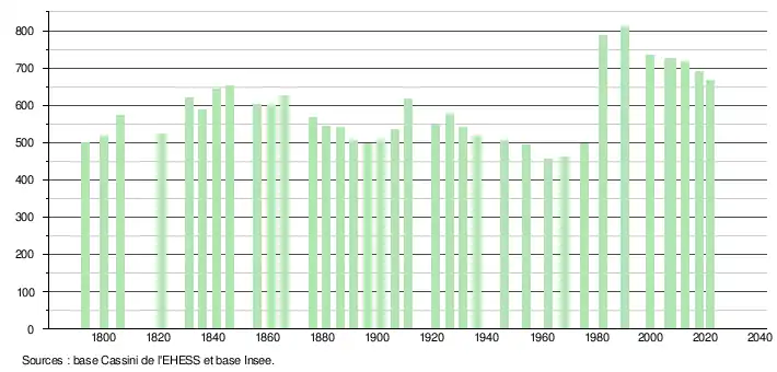 L'évolution du nombre d'habitants est connue à travers les recensements de la population effectués dans la commune depuis 1793. Pour les communes de moins de 10 000 habitants, une enquête de recensement portant sur toute la population est réalisée tous les cinq ans, les populations légales des années intermédiaires étant quant à elles estimées par interpolation ou extrapolation[26]. Pour la commune, le premier recensement exhaustif entrant dans le cadre du nouveau dispositif a été réalisé en 2007[27].