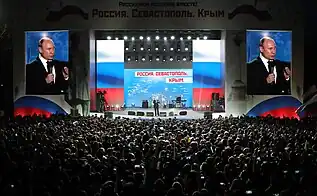 - Culte de la personnalité de Poutine en tant que "héros national", par glorification dans les médias[3],[4].