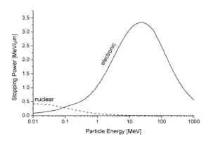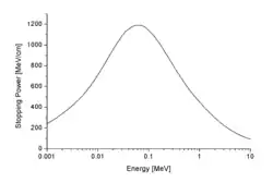 En traversant la matière, les particules chargées ionisent les atomes ou les molécules le long de leur parcours, avec pour conséquence que les particules perdent peu à peu leur énergie. Le pouvoir d'arrêt est la perte moyenne d'énergie de la particule par unité de distance parcourue, mesurée par exemple en MeV/cm (voir la figure ci-contre).