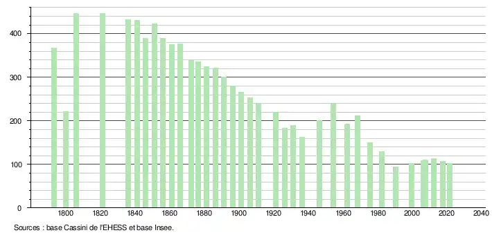 L'évolution du nombre d'habitants est connue à travers les recensements de la population effectués dans la commune depuis 1793. Pour les communes de moins de 10 000 habitants, une enquête de recensement portant sur toute la population est réalisée tous les cinq ans, les populations légales des années intermédiaires étant quant à elles estimées par interpolation ou extrapolation[19]. Pour la commune, le premier recensement exhaustif entrant dans le cadre du nouveau dispositif a été réalisé en 2007[20].