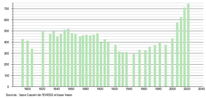 L'évolution du nombre d'habitants est connue à travers les recensements de la population effectués dans la commune depuis 1793. Pour les communes de moins de 10 000 habitants, une enquête de recensement portant sur toute la population est réalisée tous les cinq ans, les populations légales des années intermédiaires étant quant à elles estimées par interpolation ou extrapolation[26]. Pour la commune, le premier recensement exhaustif entrant dans le cadre du nouveau dispositif a été réalisé en 2006[27].
