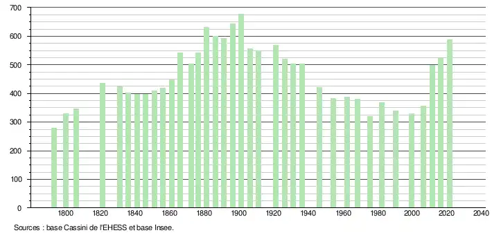 | L'évolution du nombre d'habitants est connue à travers les recensements de la population effectués dans la commune depuis 1793. Pour les communes de moins de 10 000 habitants, une enquête de recensement portant sur toute la population est réalisée tous les cinq ans, les populations légales des années intermédiaires étant quant à elles estimées par interpolation ou extrapolation[23]. Pour la commune, le premier recensement exhaustif entrant dans le cadre du nouveau dispositif a été réalisé en 2006[24]. En 2021, la commune comptait 587 habitants[Note 4], en augmentation de 13,32 % par rapport à 2015 (Aude : +2,47 %, France hors Mayotte : +1,84 %). |