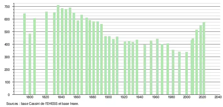 L'évolution du nombre d'habitants est connue à travers les recensements de la population effectués dans la commune depuis 1793. Pour les communes de moins de 10 000 habitants, une enquête de recensement portant sur toute la population est réalisée tous les cinq ans, les populations légales des années intermédiaires étant quant à elles estimées par interpolation ou extrapolation[20]. Pour la commune, le premier recensement exhaustif entrant dans le cadre du nouveau dispositif a été réalisé en 2007[21].