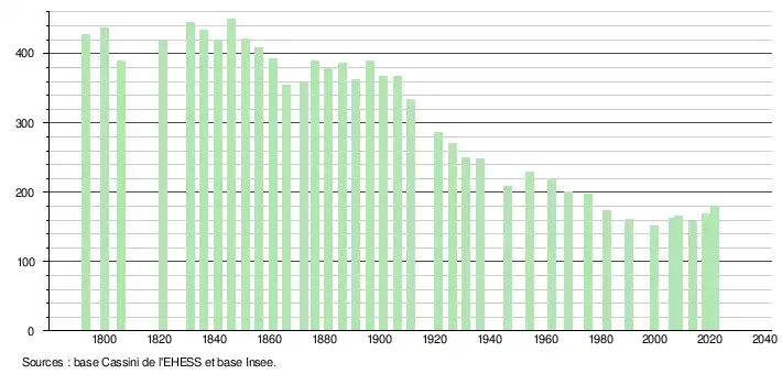 L'évolution du nombre d'habitants est connue à travers les recensements de la population effectués dans la commune depuis 1793. Pour les communes de moins de 10 000 habitants, une enquête de recensement portant sur toute la population est réalisée tous les cinq ans, les populations légales des années intermédiaires étant quant à elles estimées par interpolation ou extrapolation[45]. Pour la commune, le premier recensement exhaustif entrant dans le cadre du nouveau dispositif a été réalisé en 2008[46].