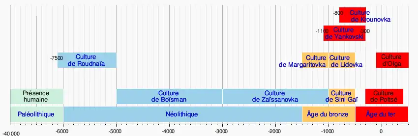 Le peuplement du Primorié est attesté il y a près de 40 000 ans[1]. Les groupes humains étaient alors des chasseurs de mammouths et d'autres grands mammifères et des cueilleurs, avec un mode de vie nomade. Leur stratégie de chasse consistait parfois à pousser l'animal jusqu'à une falaise, le faire tomber puis l'achever avant de découper la viande. La première implantation humaine connue a été trouvée près du village d'Ossinovka (raïon de Mikhaïlovka), datée entre 40 000 et 35 000 ans AP[2]. Il est probable que les rives de la Suifen étaient déjà occupées auparavant, mais aucune trace n'en a encore été trouvée[fegi 1],[fegi 2]. Les fouilles archéologiques ont montré de larges similitudes entre les sites archéologiques du Primorié et ceux des Îles Kouriles, de Sakhaline et de la partie nord-est de l'île d'Hokkaidō[3].