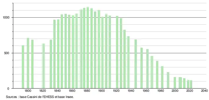 L'évolution du nombre d'habitants est connue à travers les recensements de la population effectués dans la commune depuis 1793. Pour les communes de moins de 10 000 habitants, une enquête de recensement portant sur toute la population est réalisée tous les cinq ans, les populations légales des années intermédiaires étant quant à elles estimées par interpolation ou extrapolation[20]. Pour la commune, le premier recensement exhaustif entrant dans le cadre du nouveau dispositif a été réalisé en 2007[21].