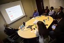 Groupe de personnes réunies autour d'une présentation assistée par ordinateur.