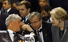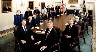 Lors de ce premier mandat, l'équipe de conseillers à la politique étrangère du président fut dirigée par le conseiller à la sécurité nationale Anthony Lake et par le secrétaire d'État Warren Christopher, qui avaient tous les deux servis dans la précédente administration Carter[17]. Le secrétaire à la Défense, Les Aspin, démissionna peu après la bataille de Mogadiscio et fut remplacé par William Perry[18]. Bentsen et McLarty démissionnèrent à leur tour en 1994 et furent remplacés respectivement par Rubin et Panetta[19]. Clinton ayant été réélu pour un second mandat, Panetta quitta ses fonctions et fut remplacé par l'ex-chef de cabinet adjoint Erskine Bowles[20]. Madeleine Albright devint la première femme secrétaire d'État et Sandy Berger succéda à Lake comme conseiller à la sécurité nationale tandis que l'ancien sénateur républicain William Cohen fut nommé secrétaire à la Défense[21]. Selon le journaliste John Harris, la proximité de Berger avec le président fit de lui le principal responsable de la politique étrangère du second mandat de Clinton, ainsi que le conseiller à la sécurité nationale le plus influent depuis Henry Kissinger[22]. John Podesta servit en tant que chef de cabinet à partir de 1998 alors que Lawrence Summers remplaça Rubin au secrétariat du Trésor en 1999[23].