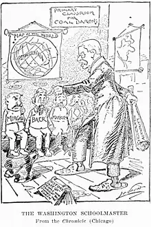 Il s'érigea par ailleurs en défenseur intransigeant de la doctrine Monroe en refusant toute présence coloniale européenne dans l'hémisphère Ouest[105]. De ce point de vue, Roosevelt se méfiait beaucoup de l'Allemagne qu'il soupçonnait de vouloir établir une base navale dans la mer des Caraïbes. Il resserra donc ses liens avec le Royaume-Uni, grand rival de Berlin, et ne donna guère de suite aux efforts de l'empereur allemand Guillaume II pour s'attirer les faveurs des États-Unis[106]. Il chercha également à renforcer la présence américaine en Asie orientale et dans le Pacifique, où le Japon et la Russie exerçaient déjà une influence considérable. Un des aspects les plus importants de la politique de Roosevelt en Asie orientale fut la doctrine de la porte ouverte qui réclamait le libre accès au marché chinois pour toutes les puissances étrangères[107].