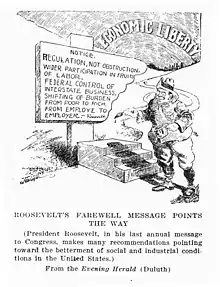 En , Roosevelt adressa un message spécial au Congrès dans lequel il se prononçait en faveur du rétablissement de la loi sur la responsabilité des employeurs, dont l'application aux sociétés interétatiques venait de motiver l'annulation par la Cour suprême[90]. Il proposa également l'adoption d'une loi nationale d'incorporation — chaque société dépendait d'une charte d'État dont le contenu variait considérablement d'un État à l'autre —, la création d'un impôt fédéral sur le revenu et d'un impôt sur les successions ciblant en priorité les plus riches, une limitation des recours judiciaires contre les syndicats pendant les grèves, qui profitaient surtout aux grandes entreprises, l'instauration de la journée de travail de 8 h pour les fonctionnaires fédéraux, la mise en place d'un système d'épargne postale afin de concurrencer les banques locales et l'interdiction pour les entreprises de financer les campagnes politiques[91],[92].