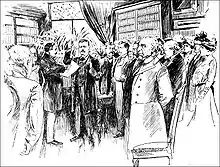 La frontière entre l'Alaska et le Canada était un sujet de litige depuis les années 1890 en raison de la ruée vers l'or du Klondike, qui avait opposé des prospecteurs américains et canadiens pour la recherche du métal précieux. Un traité réglant la question de la frontière Alaska-Canada avait été signé en 1825 entre la Russie et le Royaume-Uni, mais Saint-Pétersbourg avait revendu l'Alaska aux États-Unis en 1867. Le gouvernement américain affirma que le traité donnait à l'Alaska la souveraineté pleine et entière sur les territoires contestés, en particulier les villes de Dyea et de Skagway, alors en plein essor[129]. La crise vénézuélienne de 1902-1903 menaça brièvement d'altérer le caractère pacifique des négociations au sujet de la frontière, mais l'attitude conciliante des Britanniques pendant la crise permit de désamorcer la situation[130]. En , les États-Unis et le Royaume-Uni signèrent le traité Hay-Herbert qui confiait le soin de régler la dispute à un arbitrage de six délégués américains, britanniques et canadiens. Avec l'aide du sénateur Henry Cabot Lodge, Roosevelt parvint à faire ratifier le traité par le Sénat en février de la même année[131]. Au cours des séances du comité d'arbitrage, composé de trois délégués américains, de deux délégués canadiens et d'un seul délégué britannique, Lord Alverstone, ce dernier consentit à la plupart des revendications américaines et le comité rendit son verdict en . La décision prise par les délégués renforça les relations entre les États-Unis et le Royaume-Uni mais suscita l'indignation d'un grand nombre de Canadiens[132].