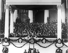 Harding fut assermenté en tant que président le , devant le portique est du Capitole. Le serment présidentiel fut administré par le juge en chef Edward Douglass White et Harding utilisa la Bible utilisée lors de la première investiture de George Washington en 1789. Ce fut la première fois qu'un président se rendit en automobile à son inauguration[22]. Dans son discours, Harding évoqua de nouveau les thèmes qu'il avait abordés au cours de sa campagne :