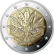 Une pièce de deux euros frappée par la Monnaie de Paris est mise en circulation. Joaquin Jimenez y a gravé un chêne et un olivier, représentants la force et la sagesse[22].