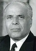 | 2 | ![]() | Zine el-Abidine Ben Ali (3 septembre 1936 - 19 septembre 2019) | 7 novembre 1987 | 14 janvier 2011 | PSD (1987-1988) RCD (1988-2011) | Premier ministre et ministre de l'Intérieur du président Bourguiba, Zine el-Abidine Ben Ali fait destituer le chef de l'État, évoquant un âge trop élevé pour continuer à présider le pays. En décembre 2010, il doit faire face à une importante vague de protestations populaires ; il quitte finalement la présidence le , sous la pression des manifestants, et se réfugie en Arabie saoudite, en compagnie de son épouse Leïla Ben Ali. |
