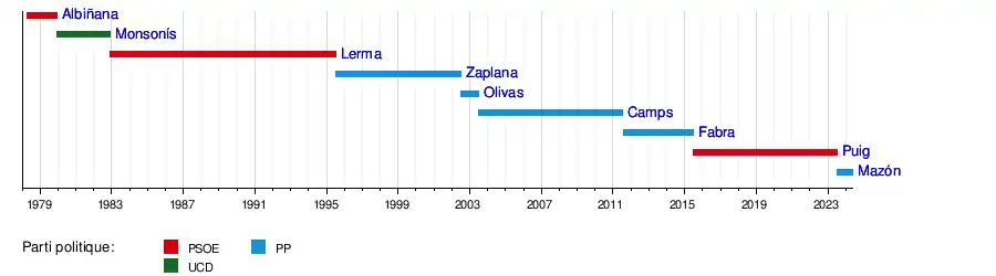 Après l'entrée en vigueur du statut, ce poste est remplacé par celui de président de la Généralité le [25]. Depuis, il a été occupé par sept titulaires, deux issus du Parti socialiste et cinq du Parti populaire.