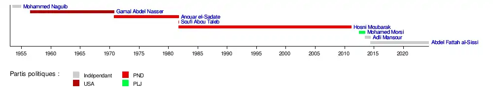 Fawzi ; Sedki ; Sadate I ; Hejazi ; Salem ; Khalil ; Sadate II | Parti national démocratique | Premier ministre | Succède à Nasser en 1970[17]. Fait adopter une nouvelle constitution en 1971[18]. Participe à la guerre du Kippour en 1973[19] puis signe un accord de paix avec Israël (camp David)[20]. Assassiné par un soldat islamiste en 1981[21]. | ||