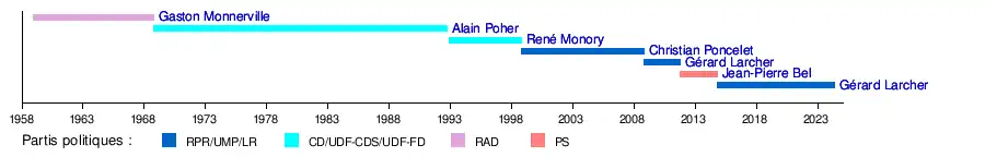 UDF-CDS, UDF-FD | Élu après avoir devancé Charles Pasqua, puis réélu trois ans plus tard, il est candidat à sa propre succession en 1998. À la surprise générale, il est devancé au premier tour par le gaulliste Christian Poncelet. René Monory ne présente pas sa candidature au second tour de scrutin. | ||