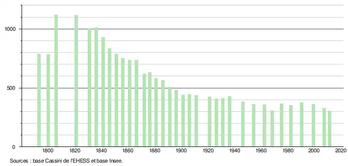 - Dans le tableau des recensements et le graphique, par convention dans Wikipédia, le principe a été retenu, pour les populations légales postérieures à 1999 de n’afficher dans le tableau des recensements et le graphique que les populations correspondant à l'année 2006, première population légale publiée calculée conformément aux concepts définis dans le décret no 2003-485 du 5 juin 2003, et les années correspondant à une enquête exhaustive de recensement pour les communes de moins de 10 000 habitants, ainsi que la dernière population légale publiée par l’Insee.