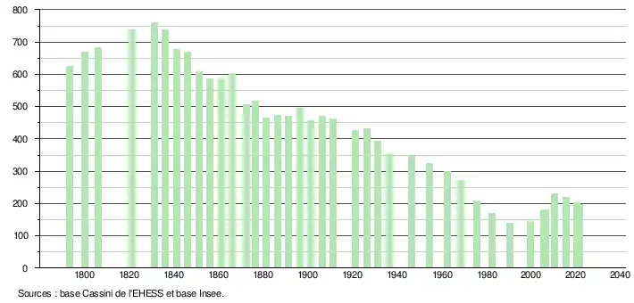L'évolution du nombre d'habitants est connue à travers les recensements de la population effectués dans la commune depuis 1793. Pour les communes de moins de 10 000 habitants, une enquête de recensement portant sur toute la population est réalisée tous les cinq ans, les populations légales des années intermédiaires étant quant à elles estimées par interpolation ou extrapolation[16]. Pour la commune, le premier recensement exhaustif entrant dans le cadre du nouveau dispositif a été réalisé en 2005[17].