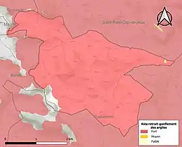 La commune est vulnérable au risque de mouvements de terrains constitué principalement du retrait-gonflement des sols argileux[20]. Cet aléa est susceptible d'engendrer des dommages importants aux bâtiments en cas d’alternance de périodes de sécheresse et de pluie. 97,8 % de la superficie communale est en aléa moyen ou fort (76,3 % au niveau départemental et 48,5 % au niveau national). Sur les 69 bâtiments dénombrés sur la commune en 2019, 69 sont en aléa moyen ou fort, soit 100 %, à comparer aux 90 % au niveau départemental et 54 % au niveau national. Une cartographie de l'exposition du territoire national au retrait gonflement des sols argileux est disponible sur le site du BRGM[21],[Carte 3].