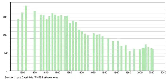 | L'évolution du nombre d'habitants est connue à travers les recensements de la population effectués dans la commune depuis 1793. Pour les communes de moins de 10 000 habitants, une enquête de recensement portant sur toute la population est réalisée tous les cinq ans, les populations légales des années intermédiaires étant quant à elles estimées par interpolation ou extrapolation[24]. Pour la commune, le premier recensement exhaustif entrant dans le cadre du nouveau dispositif a été réalisé en 2004[25]. En 2021, la commune comptait 120 habitants[Note 5], en diminution de 9,09 % par rapport à 2015 (Tarn : +1,82 %, France hors Mayotte : +1,84 %). |