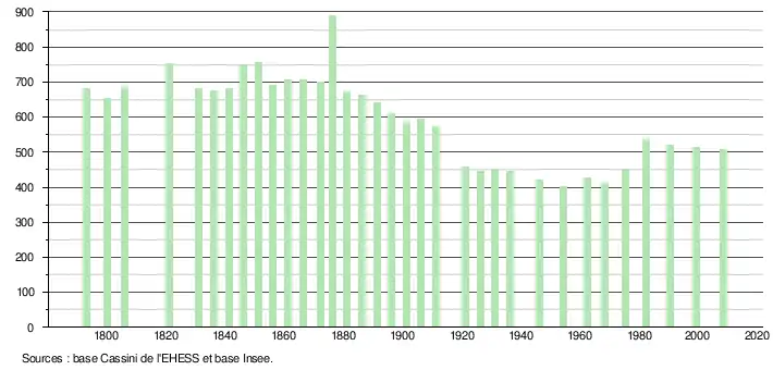 L'évolution du nombre d'habitants est connue à travers les recensements de la population effectués dans la commune depuis 1793. À partir du , les populations légales des communes sont publiées annuellement dans le cadre d'un recensement qui repose désormais sur une collecte d'information annuelle, concernant successivement tous les territoires communaux au cours d'une période de cinq ans. Pour les communes de moins de 10 000 habitants, une enquête de recensement portant sur toute la population est réalisée tous les cinq ans, les populations légales des années intermédiaires étant quant à elles estimées par interpolation ou extrapolation[2]. Pour la commune, le premier recensement exhaustif entrant dans le cadre du nouveau dispositif a été réalisé en 2008[3],[Note 1].