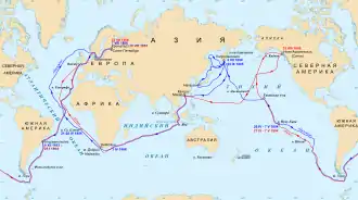 La première circumnavigation russe est entreprise en 1803-1806 sur les navires Nadejda et Neva (en) sous le commandement de Johann Adam von Krusenstern[1] et Iouri Lissianski. Initialement, l'expédition est conçue comme une entreprise commerciale de la Compagnie russe d'Amérique pour approvisionner le Kamtchatka et les possessions russes en Amérique du Nord, ainsi que pour consolider la Russie dans les possessions éloignées de l'océan Pacifique. En raison de difficultés financières, l'équipement est financé par l'État et les tâches de l'expédition sont donc considérablement élargies politiquement : il faut explorer Sakhaline et les îles Kouriles, établir des relations diplomatiques avec le Japon et ouvrir le marché chinois au commerce en fourrures russes[1]. La partie chinoise de l'expédition est à la volonté de Youri Golovkine. Dans les îles hawaïennes, les navires se séparent : le Nadejda va au Kamtchatka et au Japon, tandis que le Neva va à l'île Kodiak, où elle reste pendant quatorze mois, participant à la guerre russo-tlingite (ru).