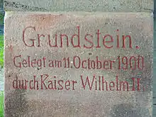 - Parfois, une pierre tombale lapidaire est placée dans les murs du bâtiment au-dessus du niveau du sol afin de rester visible de l'extérieur ou de l'intérieur. Ce type de première pierre a été posé, par exemple, lors de la pose de la première pierre par Guillaume II le 11. Octobre 1900 utilisé pour la reconstruction du fort romain de Saalburg.